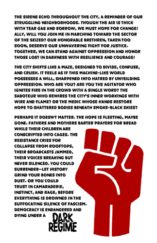 The sirens echo throughout the city, a reminder of our struggling neighborhoods. Though the air is thick with tear gas and sorrow, we must hope for change! Ally, will you join me in marching toward the Sector of the Seized? Our honorable brethren, taken too soon, deserve our unwavering fight for justice. Together, we can stand against oppression and honor those lost in darkness with resilience and courage!